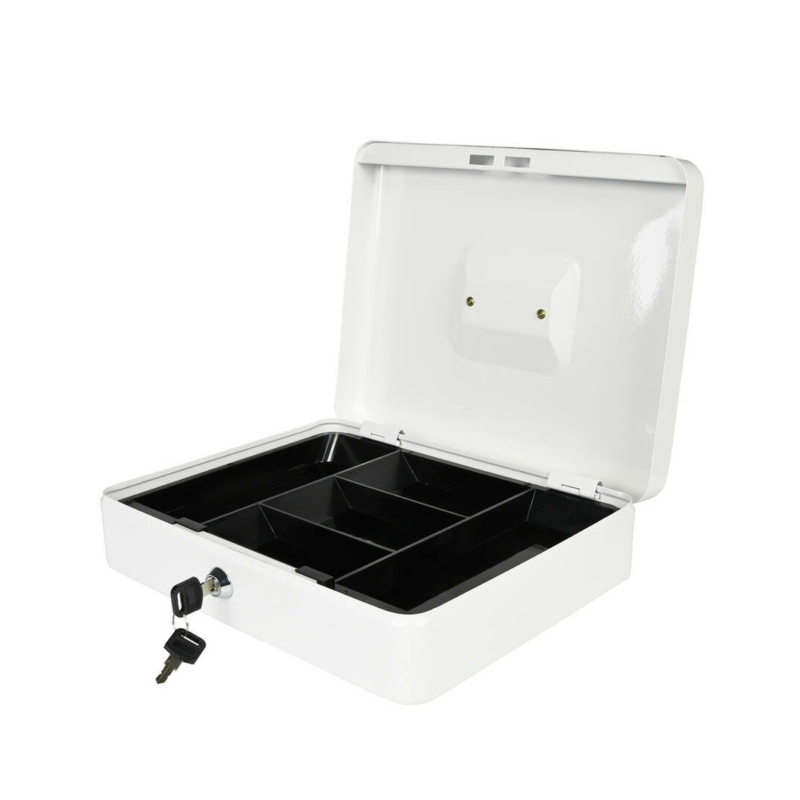 Op zoek naar een veilige en praktische manier om je geld op te bergen? Dit witte geldkistje van staalplaat is ideaal voor het netjes en veilig bewaren van brief- en muntgeld, zowel thuis als op het werk.