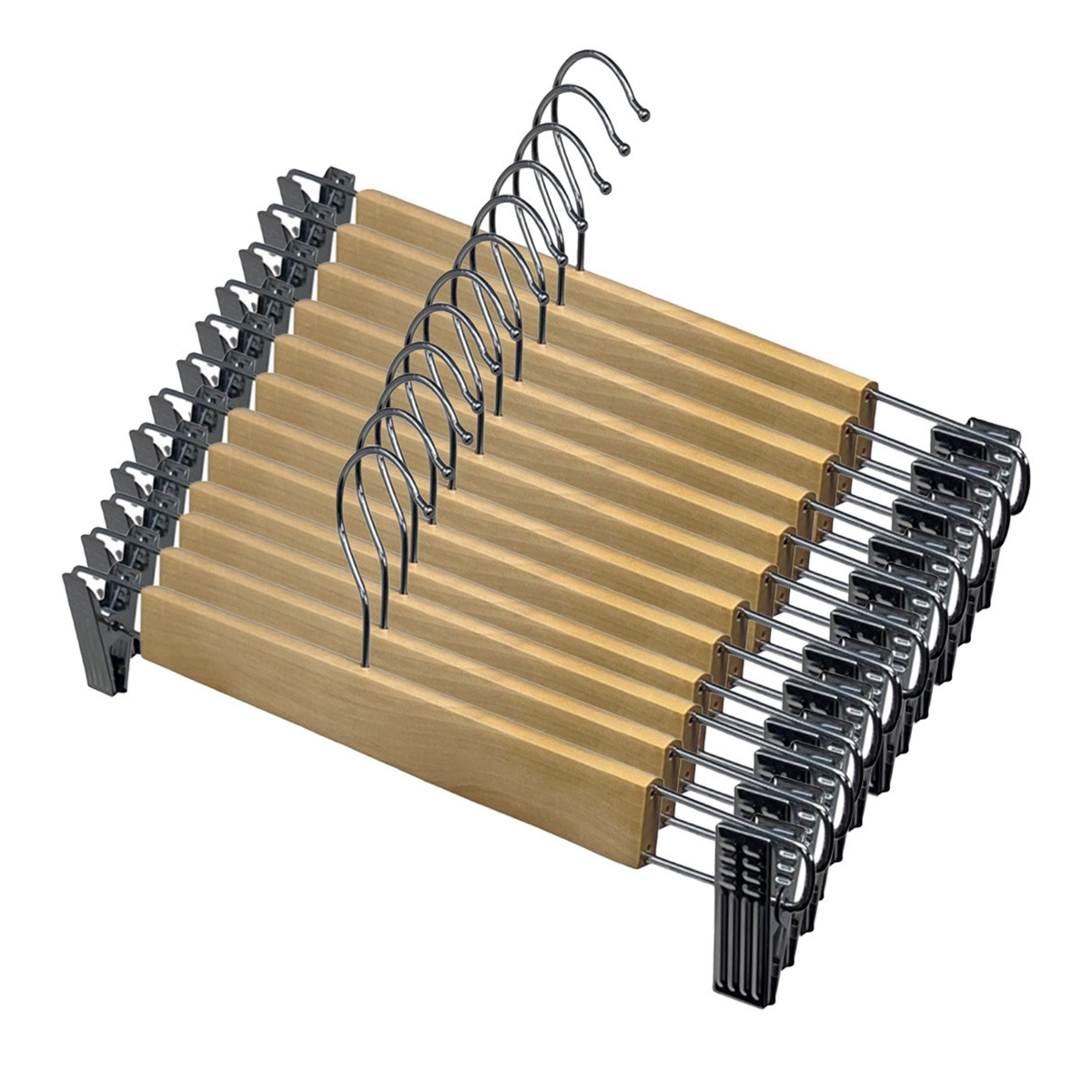 Set van 12x stuks kledinghangers voor broeken en rokken, in blank hout. Basic kleerhangers van kunststof, met verstelbare clips om broeken of rokken aan te hangen. Kledingkast broekhangers met klemmen. Materiaal: hout. Houd je kleding netjes en georganiseerd met deze stijlvolle houten kledinghangers, speciaal ontworpen voor broeken en rokken.
