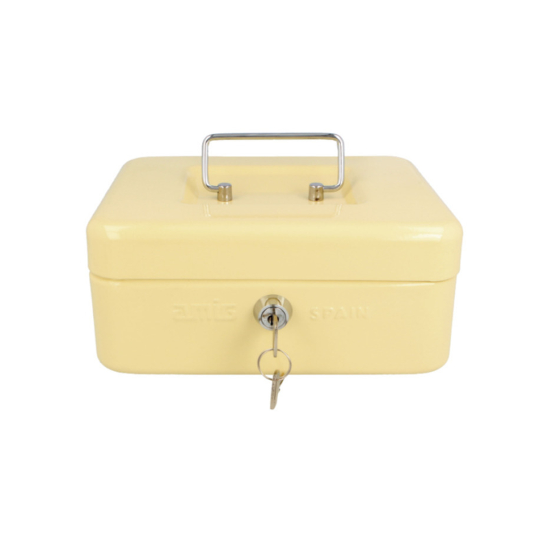 Geldkistje of geldkluisje met een slot en 2 sleutels in de kleur beige gemaakt van sterk staal. De kluis met een muntbakje biedt een praktische en veilige oplossing om uw waardevolle spullen georganiseerd en beschermd te houden. Afmeting: 15 x 11 x 7 cm.