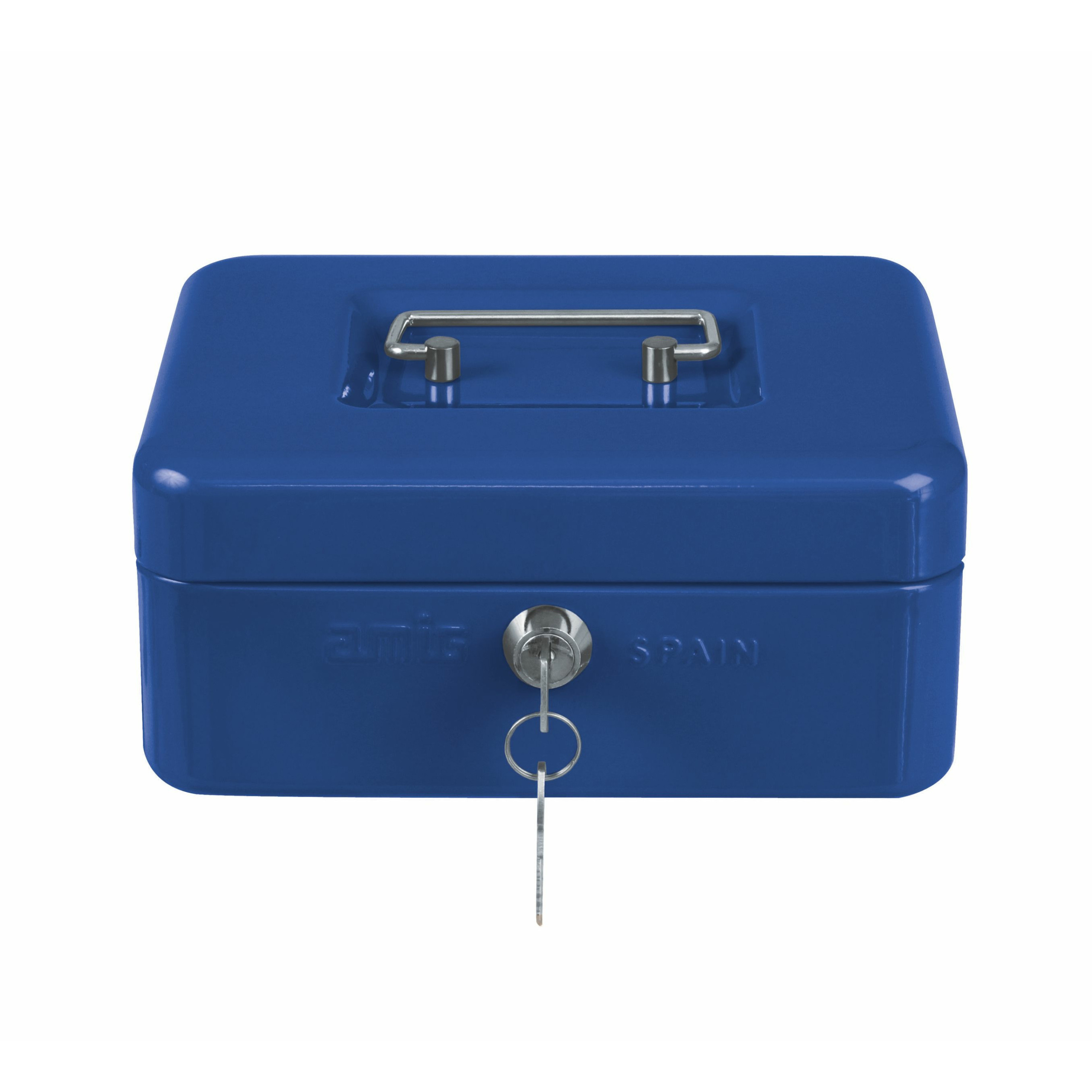 Geldkistje of geldkluisje met een slot en 2 sleutels in de kleur blauw gemaakt van sterk staal. De kluis met een muntbakje biedt een praktische en veilige oplossing om uw waardevolle spullen georganiseerd en beschermd te houden. Afmeting: 20 x 16 x 7 cm.