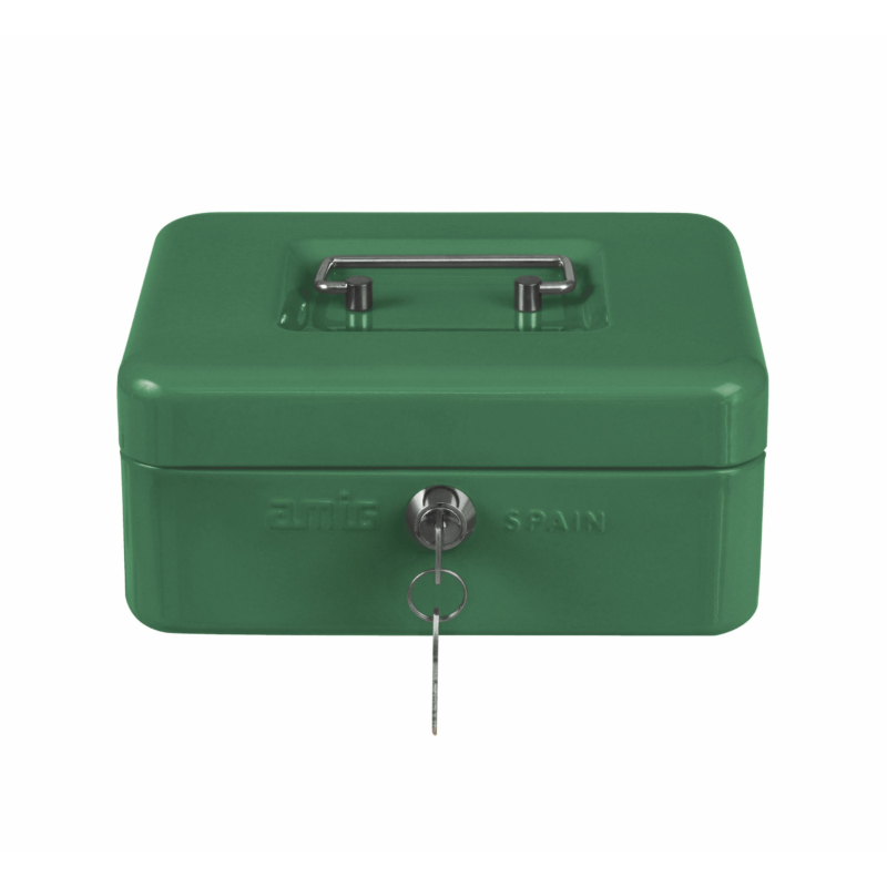 Geldkistje of geldkluisje met een slot en 2 sleutels in de kleur groen gemaakt van sterk staal. De kluis met een muntbakje biedt een praktische en veilige oplossing om uw waardevolle spullen georganiseerd en beschermd te houden. Afmeting: 20 x 16 x 9 cm.