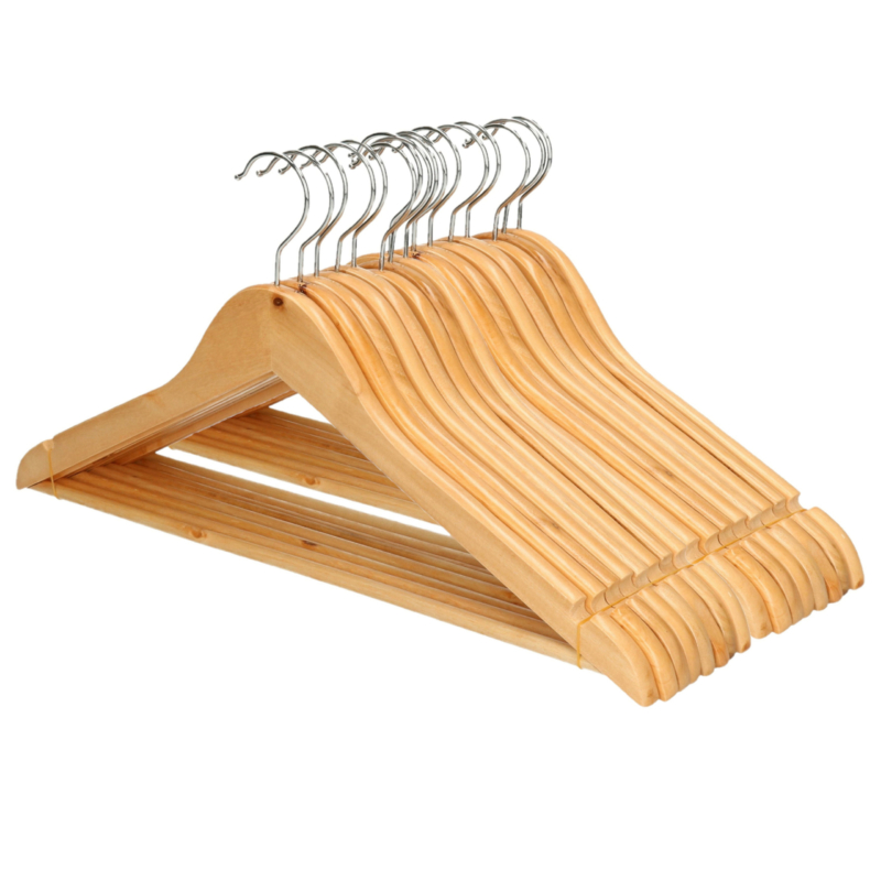 16x deze luxe houten kledinghangers met broeklat en inkepingen zijn verpakt per 8 stuks en hebben een afmeting van ca. 44 cm. Handig voor shirts, truien, vesten maar ook broeken. Afmeting: ca. 10 x 44,5 x 23 cm. Materiaal: hout.