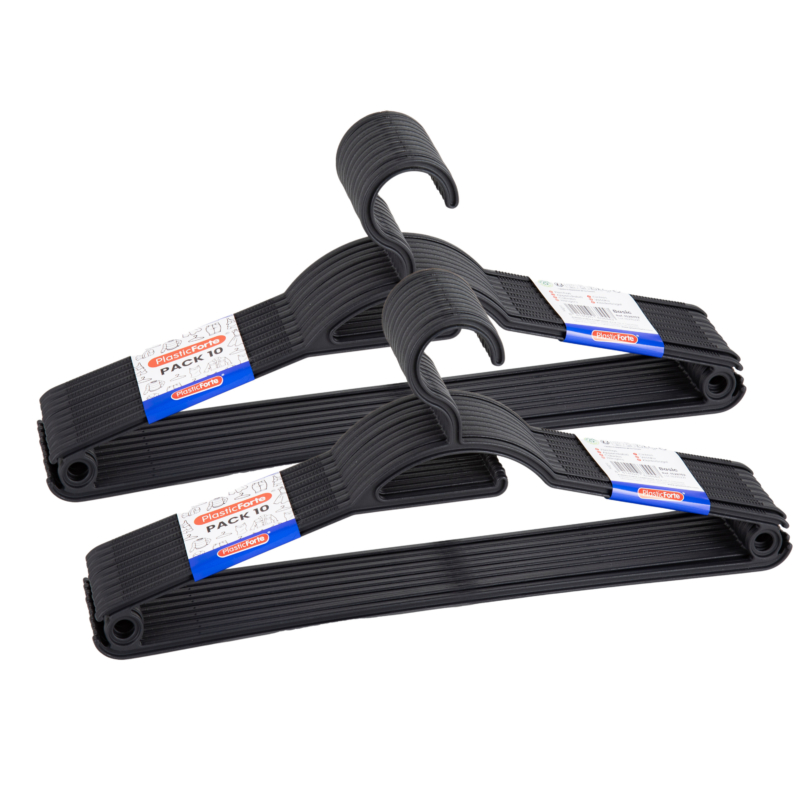 20x stuks garderobe kledinghangers Storage, in het zwart. Set van kledinghangers/kleerhangers voor een extra voordelige setprijs per 20x stuks. Materiaal: stevig kunststof. Afmetingen per kledinghanger: 40 x 18 x 0,6 cm. De haak is niet draaibaar. Kledinghangers voor een kledingrek of kledingkast.