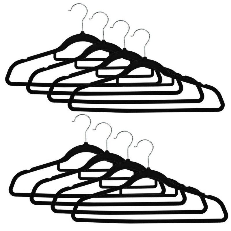8x kledinghangers velours – kunststof – draaihaak – buigbaar – 44 cm. Buigbare kleerhangers van kunststof, geschikt voor volwassenen kleding. Extra geschikt voor jassen en colberts dankzij de extra brede vormgeving. Kledingkast hangers voor jassen/pakken.
