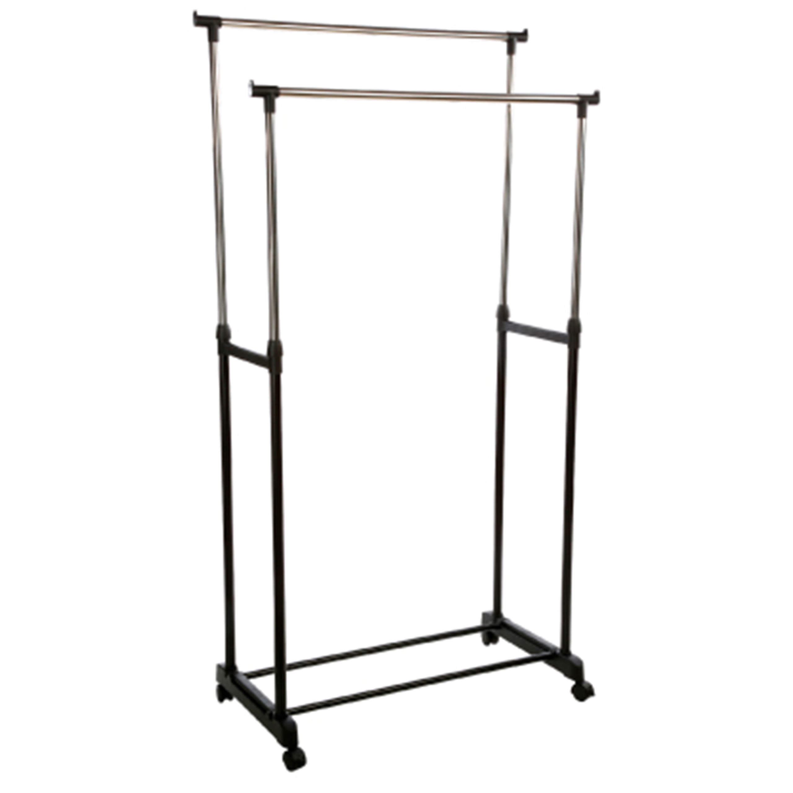 Kledingrek met dubbele hangkleding stangen gemaakt van kunststof(PP) en rvs metaal in de kleur zwart. Afmetingen: 80 x 42 x 170 cm. Uitschuifbare hoogte van 97 tot 170 cm. Makkelijk te verplaatsen met de zwenkwielen. Zelf monteren. Draagvermogen maximaal 20 kilo. Handig kledingrek voor slaapkamer en/of zolder.