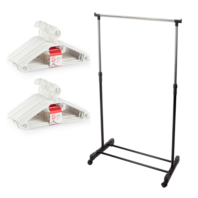 Mobiel kledingrek met kleding hangers – 20 kunststof hangers – wit/zwart