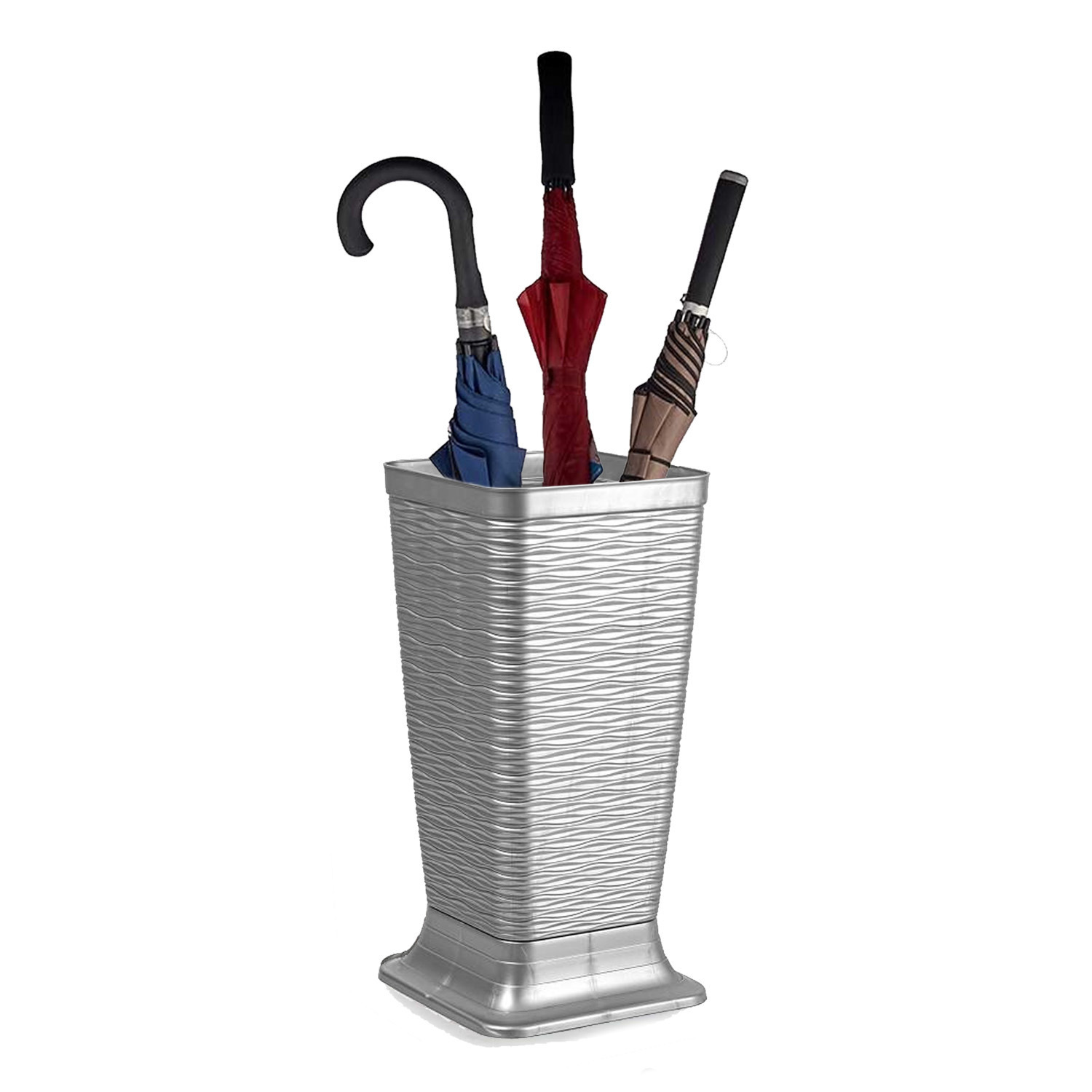 Een parapluhouder/standaard bak Waves met een relief patroon buitenzijde, gemaakt van stevig kunststof. Handig voor het opbergen en uit laten lekken van de paraplu’s. De houder heeft ruimte voor ongeveer 6 a 8 paraplu’s. Formaat: 26 x 26 x 52 cm. Materiaal: kunststof. Paraplu uitlek opbergbak.