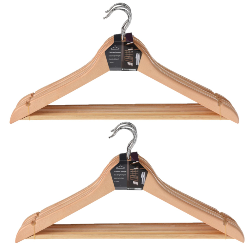 Set van 12x houten kledinghangers met broekstang. De hangers hebben een broekstang aan de onderzijde en inkepingen aan de bovenzijde om een t-shirt of hemd op te hangen, zonder dat deze van de hanger af glijdt. Geschikt voor volwassenen kleding.